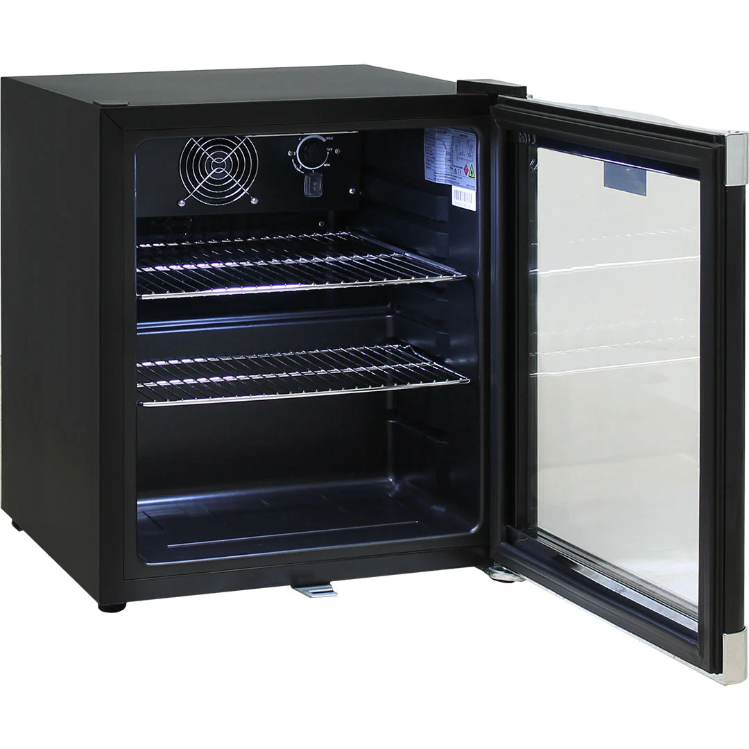 Tropical rated glass door mini bar fridge, very well built unit with internal fan, chromed shelves, chrome door trims, lockable reversible door and a brilliant finish. Very stable temperature and plenty of shelf adjustments with 1 x full sized and 1 x half sized shelves.